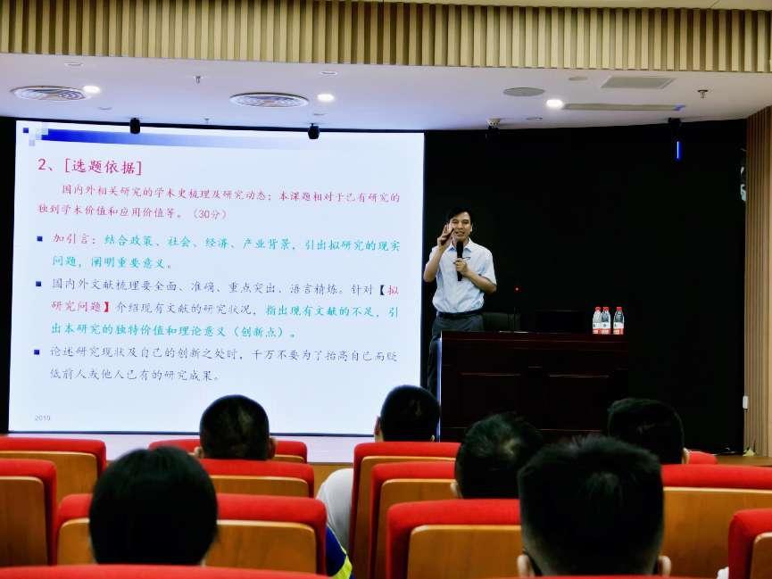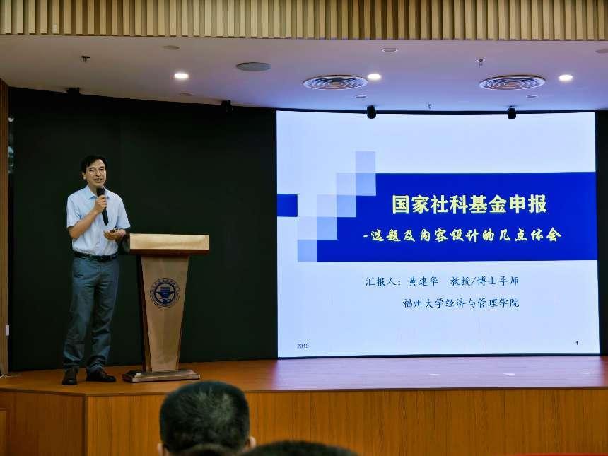 活動邀請了福州大學經濟與管理學院黃建華教授作主題講座。黃建華教授是福州大學物流研究院副院長、福建省高層次人才、博士生導師。國家社科基金通訊評審專家,福建省、湖南省、河北省、江西省等省份的自然科學基金項目函評專家;兼任教育部學位中心博士論文、碩士論文評審專家,福建省政府投資項目評審專家、福州市發(fā)改委項目評審專家;福建省應急廳應急管理專家。講座以“國家社科基金申報”為題,為參會的博士教師們作了精彩報告。黃教授圍繞國家社科基金項目的指南走向、選題原則、論證活頁和申報書撰寫技術細節(jié)等視角展開分享。他強調雖然國社科從課題指南發(fā)布到提交時間比較短,但中標的課題一定是一個長期思考與積累的結果。他鼓勵與會教師,將個人學術研究興趣與國家和社會發(fā)展相融合,積極申報,反復打磨,爭取盡早取得突破。
