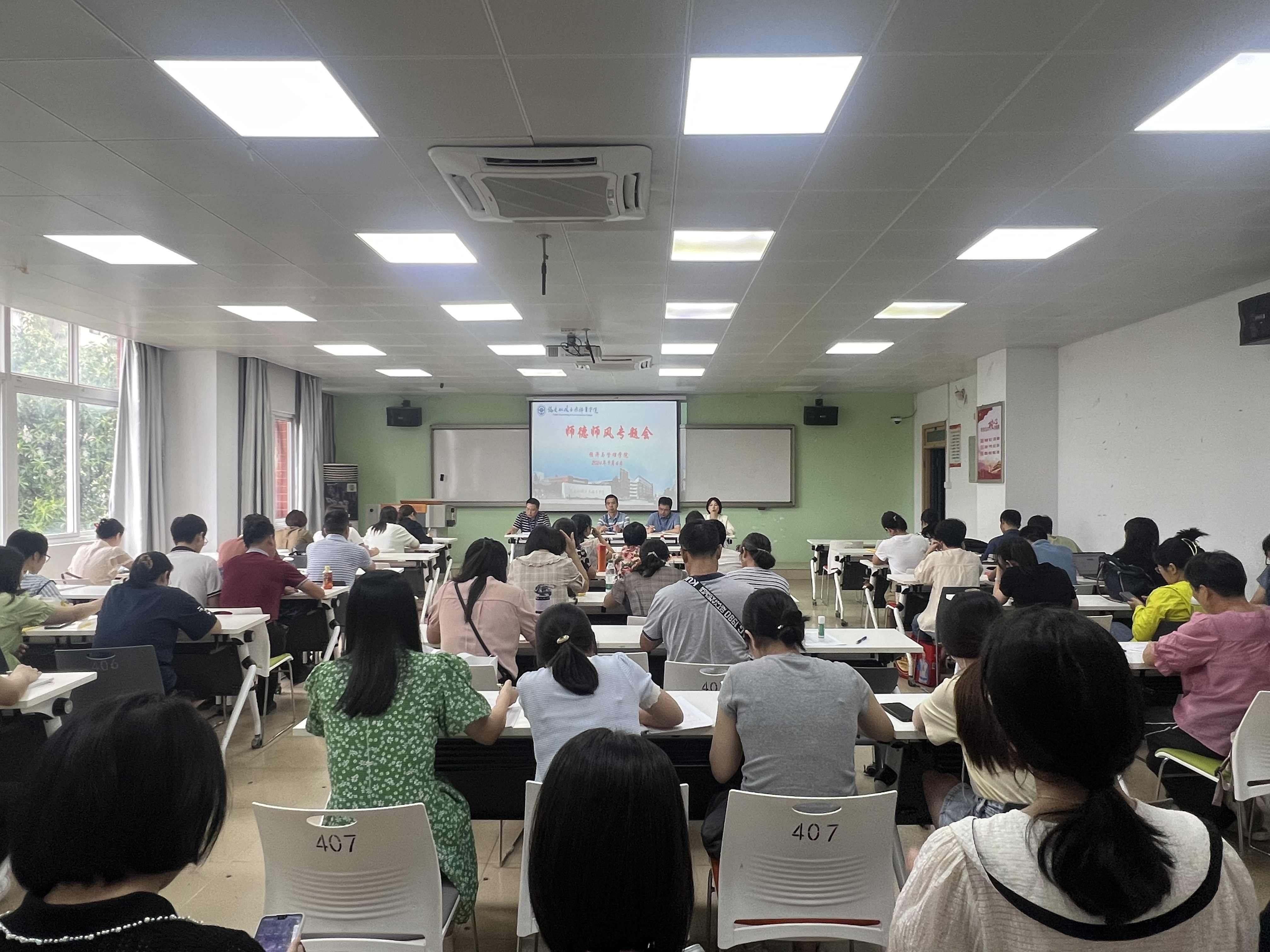 為大力弘揚(yáng)教育家精神,加強(qiáng)新時(shí)代高素質(zhì)專(zhuān)業(yè)化教師隊(duì)伍建設(shè),營(yíng)造尊師重教良好氛圍,進(jìn)一步推進(jìn)經(jīng)濟(jì)與管理學(xué)院師德師風(fēng)建設(shè)工作,9月4日,經(jīng)濟(jì)與管理學(xué)院召開(kāi)師德師風(fēng)教育專(zhuān)題會(huì)議,本次會(huì)議由黨總支書(shū)記俞素平主持,全體教職工參會(huì)。