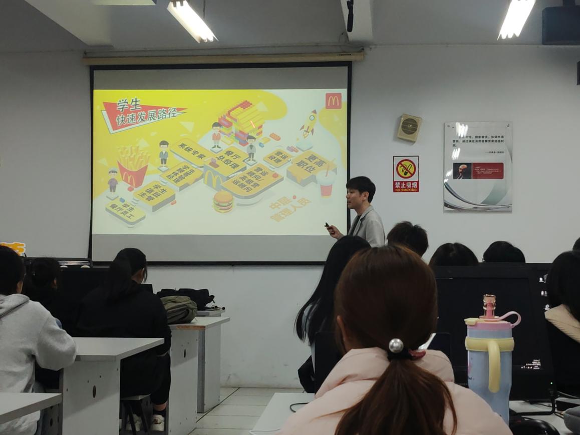 麥當(dāng)勞招聘專員孔焰老師結(jié)合麥當(dāng)勞人才培養(yǎng)體系,給同學(xué)上了一堂生動的《餐飲行業(yè)認知課》,解析零售行業(yè)對營銷人才的能力要求,引導(dǎo)學(xué)生樹立 “細節(jié)決定品質(zhì)” 的職業(yè)意識。