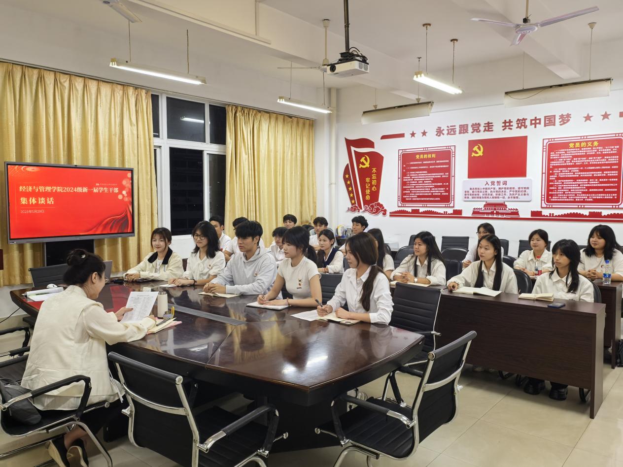 5月29日,經(jīng)濟與管理學(xué)院召開2024級新一屆學(xué)生干部集體談話會。學(xué)院黨總支書記陳慧、學(xué)院團委書記傅一丹及全體新任學(xué)生干部參加了會議。