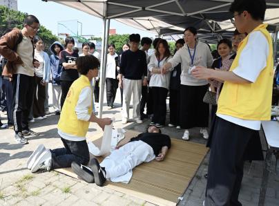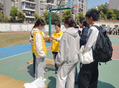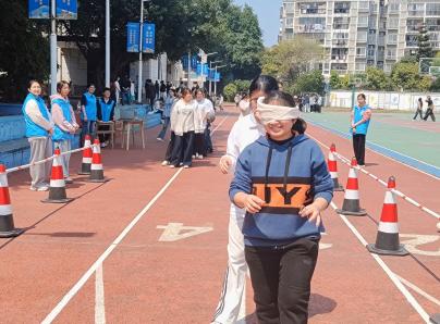 逃生演練完成后,現(xiàn)場開展多項自救演練。林麗萍副書記演示干粉滅火器“提、拔、握、壓”操作口訣,指導學生代表分組滅火;紅十字會成員模擬燒傷、摔傷場景,演示急救包扎方法;自律會成員教授固定結、連接結等繩結打法,并組織“盲人逃生”信任體驗活動,模擬濃煙環(huán)境下的協(xié)作逃生。師生們踴躍參與,現(xiàn)場氣氛熱烈。