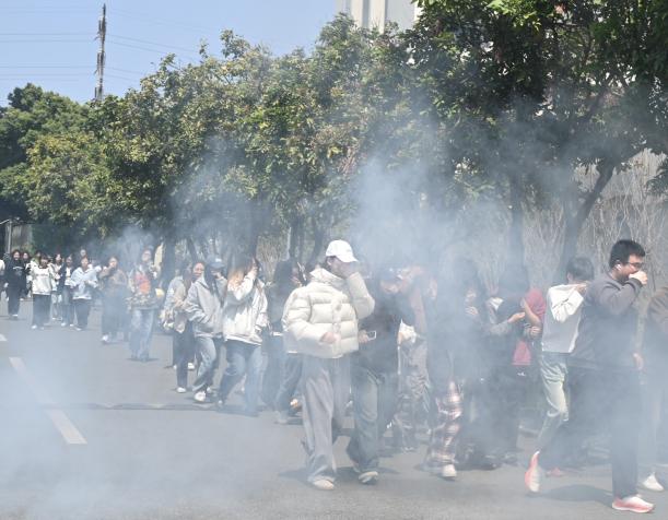 中午12時20分,消防警報拉響,模擬煙霧釋放,師生們迅速反應,捂住口鼻,彎腰低姿,沿預定路線有序撤離至操場集合點。