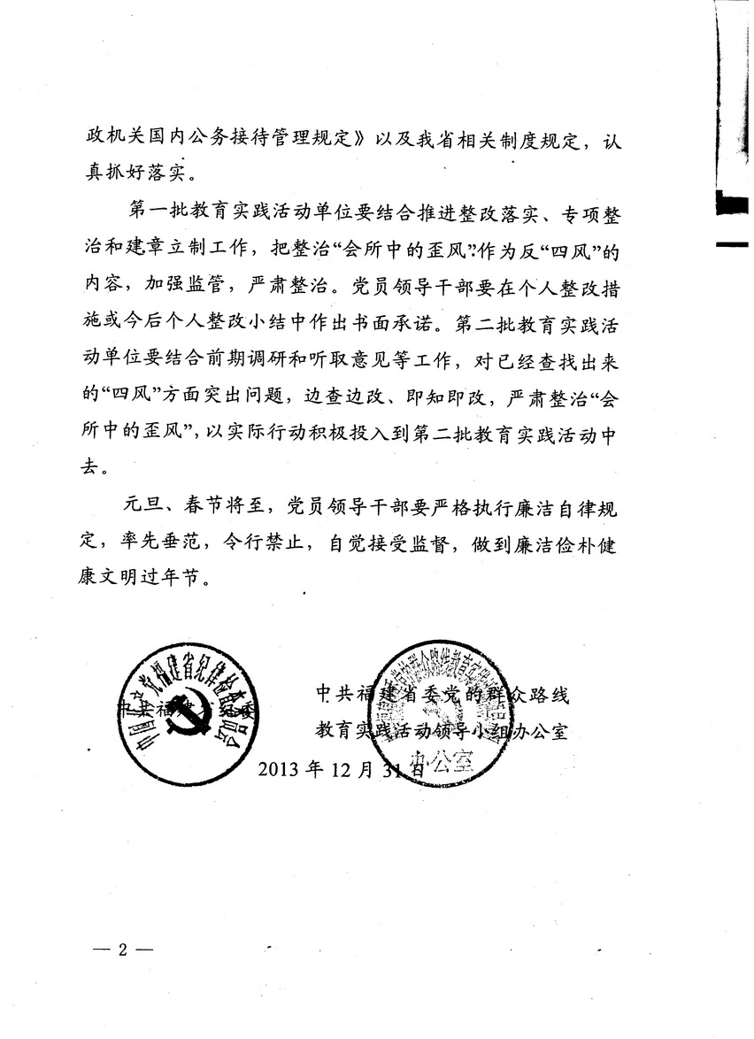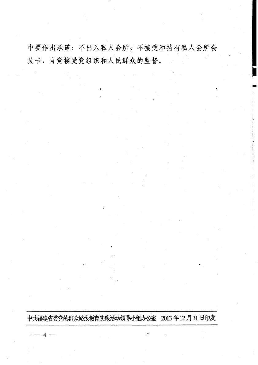 現(xiàn)將中共福建省委黨的群眾路線教育實(shí)踐活動領(lǐng)導(dǎo)小組辦公室《關(guān)于轉(zhuǎn)發(fā)中央紀(jì)委、中央教育實(shí)踐活動領(lǐng)導(dǎo)小組在黨的群眾路線教育實(shí)踐活動中嚴(yán)肅整治“會所中的歪風(fēng)”的通知》(閩群組辦〔2013〕19號)轉(zhuǎn)發(fā)給你們,請高度重視,抓好落實(shí)。廳直單位領(lǐng)導(dǎo)班子成員及廳機(jī)關(guān)副處級以上干部要于2月10日前作出書面承諾(詳見附件2),書面承諾經(jīng)本人簽名后交廳教育實(shí)踐活動辦。