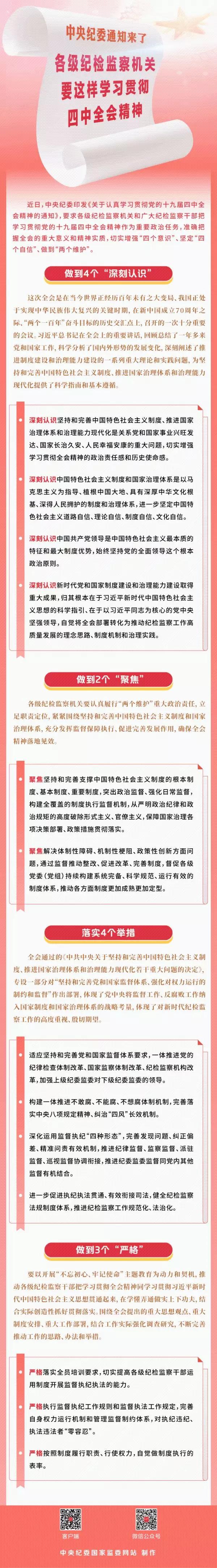 《通知》指出,全會通過的《中共中央關(guān)于堅持和完善中國特色社會主義制度、推進國家治理體系和治理能力現(xiàn)代化若干重大問題的決定》,專設(shè)一部分對“堅持和完善黨和國家監(jiān)督體系、強化對權(quán)力運行的制約和監(jiān)督”作出部署,體現(xiàn)了黨中央將監(jiān)督工作、反腐敗工作納入國家制度和國家治理體系的戰(zhàn)略考量,體現(xiàn)了對新時代紀檢監(jiān)察工作的高度重視、殷切期望。要適應(yīng)堅持和完善黨和國家監(jiān)督體系要求,一體推進黨的紀律檢查體制改革、國家監(jiān)察體制改革、紀檢監(jiān)察機構(gòu)改革,加強上級紀委監(jiān)委對下級紀委監(jiān)委的領(lǐng)導;構(gòu)建一體推進不敢腐、不能腐、不想腐體制機制,完善落實中央八項規(guī)定精神、糾治“四風”長效機制;深化運用監(jiān)督執(zhí)紀“四種形態(tài)”,完善發(fā)現(xiàn)問題、糾正偏差、精準問責有效機制,推進紀律監(jiān)督、監(jiān)察監(jiān)督、派駐監(jiān)督、巡視監(jiān)督協(xié)調(diào)銜接,推進紀委監(jiān)委監(jiān)督同黨內(nèi)其他監(jiān)督有機結(jié)合;進一步促進執(zhí)紀執(zhí)法貫通、有效銜接司法,健全紀檢監(jiān)察法規(guī)制度體系,推進紀檢監(jiān)察工作規(guī)范化、法治化。