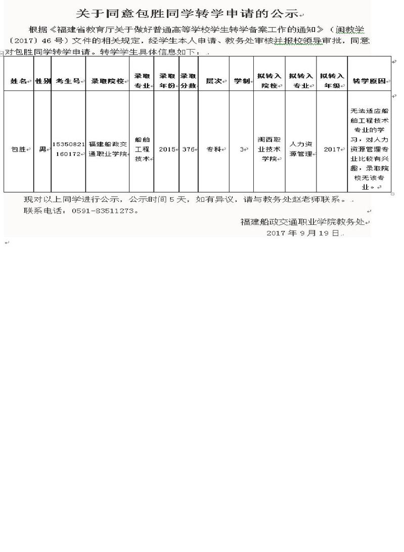 關(guān)于同意包勝同學(xué)轉(zhuǎn)學(xué)申請(qǐng)的公示