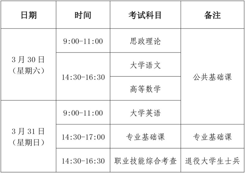 1.普通考生(含選擇本類型的獲獎考生)和脫貧戶家庭考生(含選擇本類型的獲獎考生)的考試安排在2024年3月30日至 31日進(jìn)行??荚嚳颇糠譃楣不A(chǔ)課和專業(yè)基礎(chǔ)課,總分滿分600分。公共基礎(chǔ)課3門,每門滿分100分,每門考試時長120分鐘,專業(yè)基礎(chǔ)課1門,滿分300分,考試時長150分鐘。