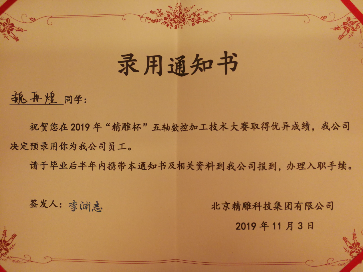 2019年度全國(guó)機(jī)械行業(yè)職業(yè)教育技能大賽——“精雕杯”五軸數(shù)控加工技術(shù)的比賽于10月31日至11月2日在廣東東莞舉行,我院學(xué)生吳仲川、魏再煌組成的代表隊(duì)榮獲全國(guó)第二名暨一等獎(jiǎng),指導(dǎo)教師李云妹、謝祖華被評(píng)為“優(yōu)秀指導(dǎo)教師”,吳仲川、魏再煌兩位同學(xué)憑借嫻熟的技能和優(yōu)異的表現(xiàn)直接被北京精雕科技集團(tuán)有限公司錄用,畢業(yè)后可直接前往北京辦理入職手續(xù)。