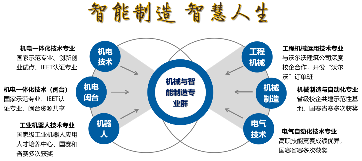 機械與智能制造專業(yè)群主要由機電一體化技術(shù)、工業(yè)機器人技術(shù)、電氣自動化技術(shù)、機械制造與自動化技術(shù)和工程機械運用技術(shù)等5個專業(yè)組成。面向先進制造業(yè)的數(shù)字化設(shè)計、智能化生產(chǎn)、智慧化服務(wù)、工程機械運用等領(lǐng)域用人單位,以立德樹人為根本,突出工業(yè)產(chǎn)品生命全周期管理意識;培養(yǎng)具備數(shù)字化設(shè)計,智能制造,生產(chǎn)質(zhì)量品控,機電設(shè)備安裝,智能控制,成套機電設(shè)備調(diào)試,智慧電氣監(jiān)控、工程機械運用與維修等復(fù)合能力,具有可持續(xù)發(fā)展能力的智能產(chǎn)線工藝設(shè)計員、機電控制系統(tǒng)設(shè)計員、產(chǎn)品三維創(chuàng)新設(shè)計員、機械制造工藝設(shè)計員、工業(yè)機器人控制技術(shù)員、機電設(shè)備運行技術(shù)員 、智能產(chǎn)線操作技術(shù)員 、自動加工島操作技術(shù)員 、精密測量與檢測技術(shù)員、自動化系統(tǒng)維護技術(shù)員、工業(yè)機器人維護技術(shù)員、智慧電氣系統(tǒng)維護技術(shù)員、機電設(shè)備營銷服務(wù)專員、云平臺管理人員、工程機械維修維護和操作人員等高端技術(shù)技能人才,為制造強國和區(qū)域經(jīng)濟社會發(fā)展提供優(yōu)質(zhì)人才資源支撐。