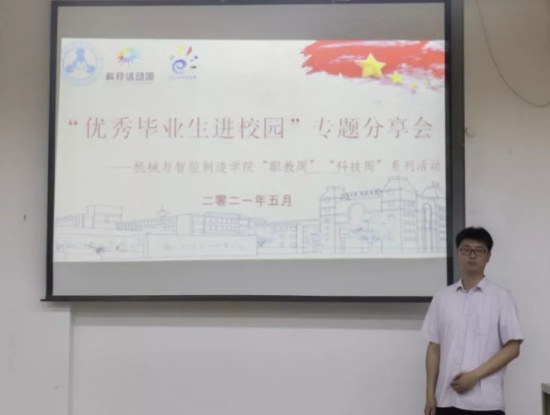同日,為進(jìn)一步加強(qiáng)學(xué)風(fēng)建設(shè),調(diào)動(dòng)學(xué)生學(xué)習(xí)熱情,明確奮斗方向,我院于北區(qū)26號(hào)樓605室舉辦 “職教周”“科技周”系列活動(dòng)之“優(yōu)秀畢業(yè)生進(jìn)校園主題分享會(huì)”,邀請(qǐng)2011級(jí)機(jī)電一體化專業(yè)畢業(yè)生丁智文與在校學(xué)生做分享報(bào)告。丁智文從自身求學(xué)與工作經(jīng)歷出發(fā),與同學(xué)們交流了關(guān)于學(xué)習(xí)和工作的成長心得,會(huì)上氣氛熱烈,同學(xué)們表示,此次分享會(huì)在一定程度上幫助他們找到三年大學(xué)生活的方向,引發(fā)了對(duì)人生和未來的深度思考,受益良多。