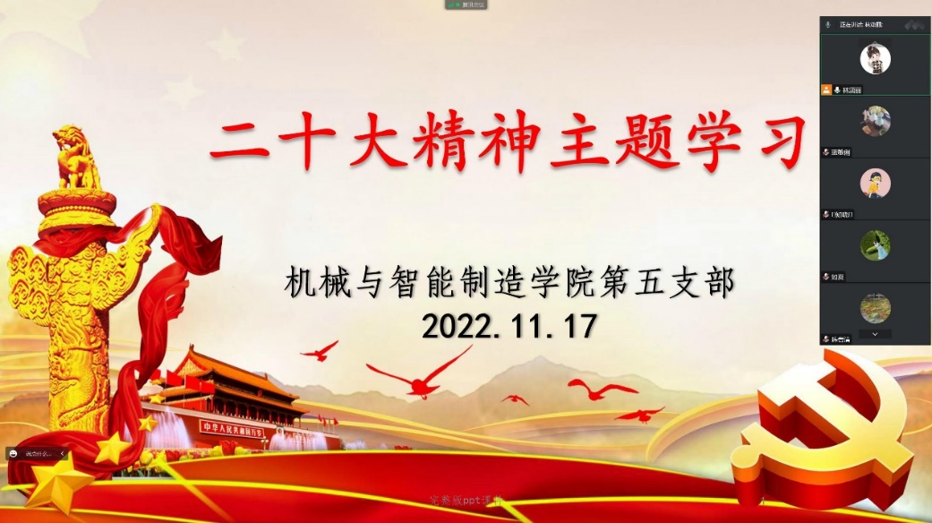 11月17日,機械與智能制造學(xué)院第五支部利用騰訊會議,組織黨員深入學(xué)習(xí)黨的二十大精神。通過黨員讀報告、談感想等多種形式,進一步領(lǐng)會黨的二十大精神,深刻認(rèn)識自己肩負(fù)的歷史使命和時代責(zé)任。