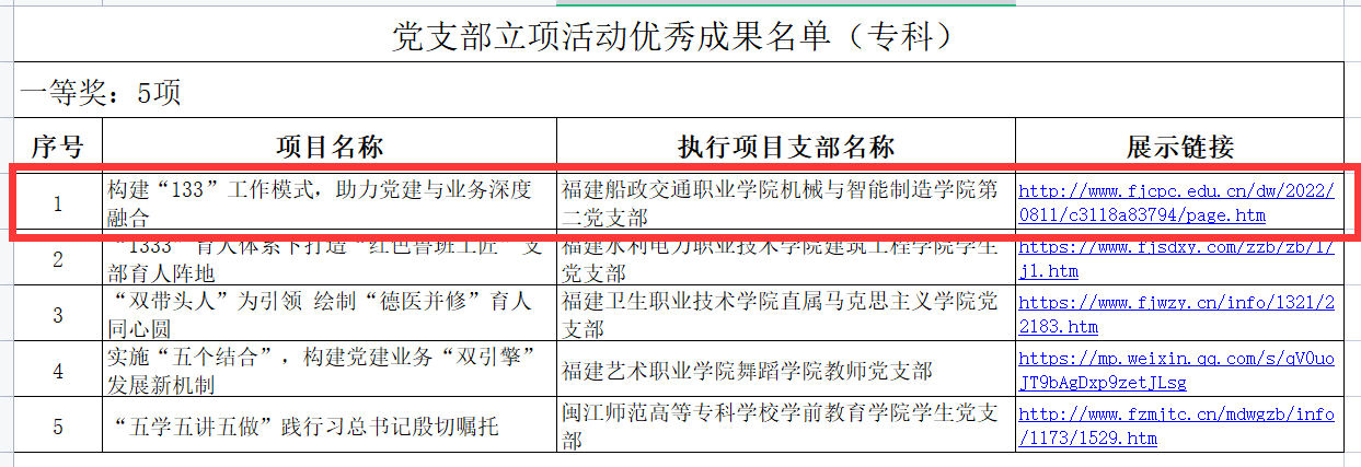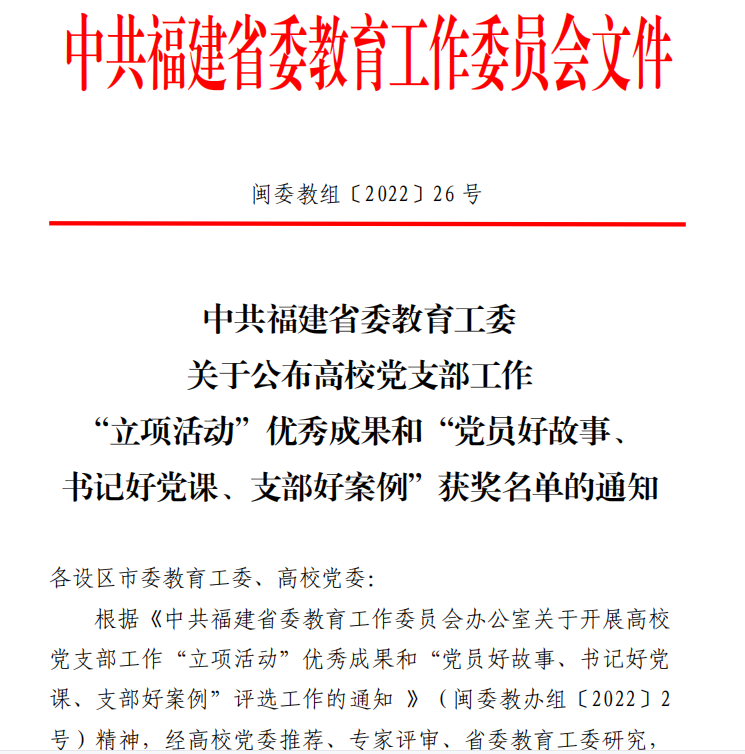 近日,中共福建省委教育工委發(fā)布了《關(guān)于公布高校黨支部工作“立項活動”優(yōu)秀成果和“黨員好故事、書記好黨課、支部好案例”獲獎名單的通知》(閩委教組〔2022〕49號)。我院第二黨支部申報的《構(gòu)建“133”工作模式,助力黨建與業(yè)務(wù)深度融合》獲得高職高專院校黨支部工作“立項活動”優(yōu)秀成果一等獎。