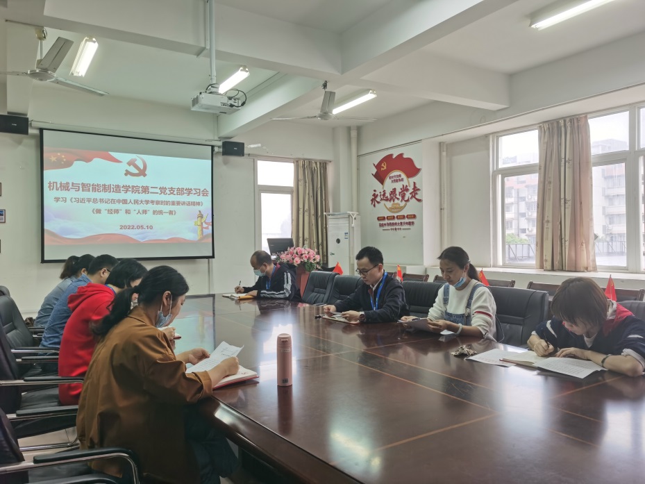 2022年5月10日,機械與智能制造學院第二黨支部召開支部學習大會,學習《習近平總書記在中國人民大學考察時的重要講話精神(摘?。?、《做“經師”和“人師”的統(tǒng)一者》等文件精神。