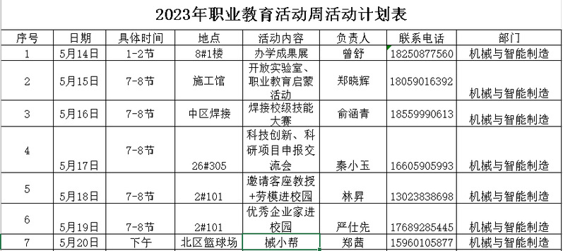 為深入學(xué)習(xí)貫徹習(xí)近平新時(shí)代中國(guó)特色社會(huì)主義思想,宣傳貫徹黨的二十大精神和習(xí)近平總書(shū)記關(guān)于職業(yè)教育的重要指示批示精神,貫徹落實(shí)新修訂的職業(yè)教育法和《關(guān)于深化現(xiàn)代職業(yè)教育體系建設(shè)改革的意見(jiàn)》,結(jié)合我院實(shí)際,推進(jìn)“雙高”建設(shè),全校決定組織開(kāi)展職業(yè)教育活動(dòng)周工作。機(jī)械與智能制造學(xué)院緊跟學(xué)校步伐,貫徹落實(shí)活動(dòng)的開(kāi)展。