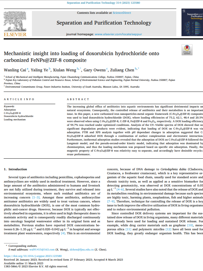 近日,福建船政交通職業(yè)學(xué)院機(jī)械與智能制造學(xué)院蔡婉玲老師在期刊《Colloids and Surfaces B: Biointerfaces》(JCR Q1IF=5.999)和期刊《Separation and Purification Technology》(JCR Q1,IF=9.136)分別發(fā)表了題為“MagneticFe3O4@ZIF-8 nanoparticles as a drug release vehicle: pH-sensitive release of norfloxacin and its antibacterial activity”和題為“Mechanistic insight into loading of doxorubicin hydrochloride onto carbonized FeNPs@ZIF-8 composite”的研究論文。
