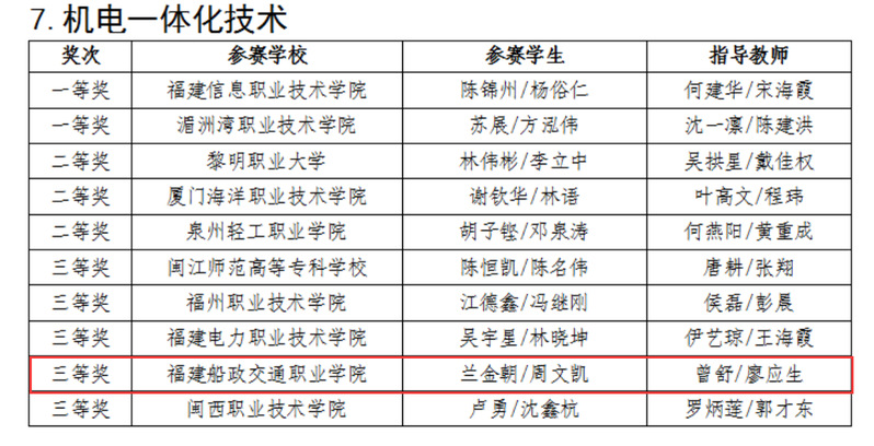 2023年12月23日-12月24日,福建省職業(yè)技能大賽“機電一體化”賽項在湄洲灣職業(yè)技術(shù)學(xué)院舉辦,來自全省的16支隊伍參賽。我院曾舒、廖應(yīng)生兩位老師指導(dǎo)的蘭金朝、周文凱同學(xué)獲得三等獎。