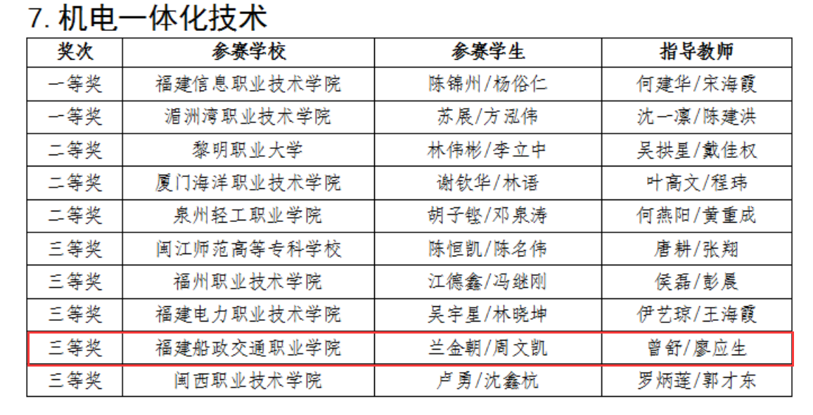 2023年12月23日-12月24日,福建省職業(yè)技能大賽“機(jī)電一體化”賽項(xiàng)在湄洲灣職業(yè)技術(shù)學(xué)院舉辦,來自全省的16支隊(duì)伍參賽。支部黨員廖應(yīng)生老師和另一位指導(dǎo)老師曾舒老師指導(dǎo)的蘭金朝、周文凱同學(xué)獲得三等獎。
