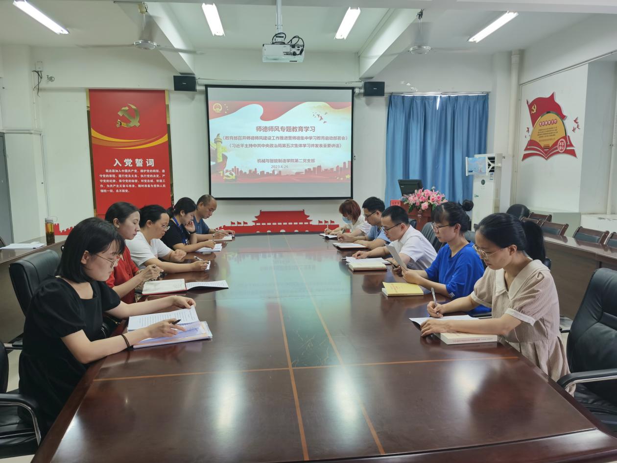 2023年6月26日,機(jī)械與智能制造學(xué)院第二黨支部開展師德師風(fēng)學(xué)習(xí)教育活動(dòng),組織學(xué)習(xí)《教育部召開師德師風(fēng)建設(shè)工作推進(jìn)暨師德集中學(xué)習(xí)教育啟動(dòng)部署會(huì)》和《習(xí)近平主持中共中央政治局第五次集體學(xué)習(xí)并發(fā)表重要講話》精神。