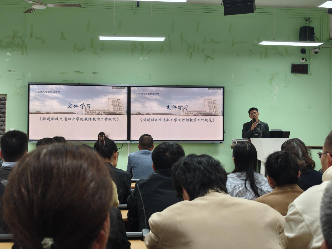 2024年11月13日,機(jī)械與智能制造學(xué)院組織全體教職工學(xué)習(xí)《福建船政交通職業(yè)學(xué)院教師教學(xué)工作規(guī)范》。曾思通副院長帶領(lǐng)全體教職工學(xué)習(xí)文件,共同學(xué)習(xí)文件中規(guī)定的教師教學(xué)要做好教學(xué)準(zhǔn)備,包括培養(yǎng)方案,授課計劃,要做好課堂教學(xué),對各教學(xué)環(huán)節(jié)時間應(yīng)分配恰當(dāng),融“教、學(xué)、做”為一體,鼓勵學(xué)生獨立思考,激發(fā)學(xué)生的主動性。他強(qiáng)調(diào),教師在人才培養(yǎng)過程中起主導(dǎo)作用,要求全體教師提高政治思想水平、業(yè)務(wù)能力和教學(xué)水平,規(guī)范工作,增強(qiáng)工作責(zé)任心,不斷提高教學(xué)質(zhì)量,培養(yǎng)合格人才。