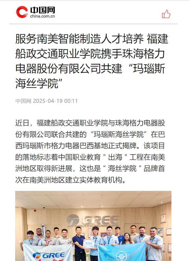 近日,福建船政交通職業(yè)學院與珠海格力電器股份有限公司聯(lián)合共建的“瑪瑙斯海絲學院”在巴西瑪瑙斯市格力電器巴西基地正式揭牌。該項目的落地標志著中國職業(yè)教育"出海"工程在南美洲地區(qū)取得新進展,這也是"海絲學院"品牌首次在南美洲地區(qū)建立實體教育機構。