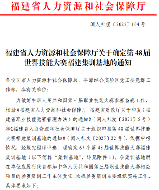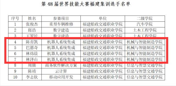 近日,福建省人力資源和社會保障廳公布第48屆世界技能大賽福建集訓(xùn)基地評選結(jié)果,機械與智能制造學(xué)院1個競賽基地成功入選福建集訓(xùn)基地,4名選手入圍福建省集訓(xùn)隊。這一突破充分展現(xiàn)了我院在技能人才培養(yǎng)方面的卓越實力,是學(xué)院深化產(chǎn)教融合、創(chuàng)新技能育人模式的成果縮影。
