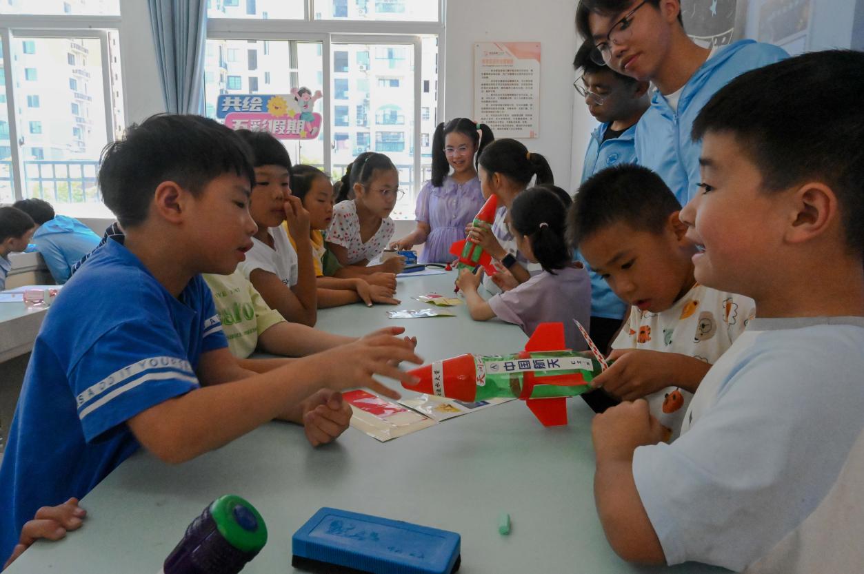 實(shí)踐團(tuán)成員帶領(lǐng)小朋友們制作火箭發(fā)射器)