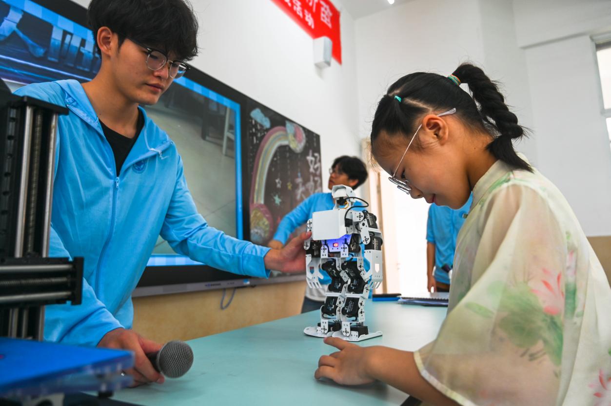 (小朋友在實踐團(tuán)成員的幫助下學(xué)習(xí)操作人形機(jī)器人)