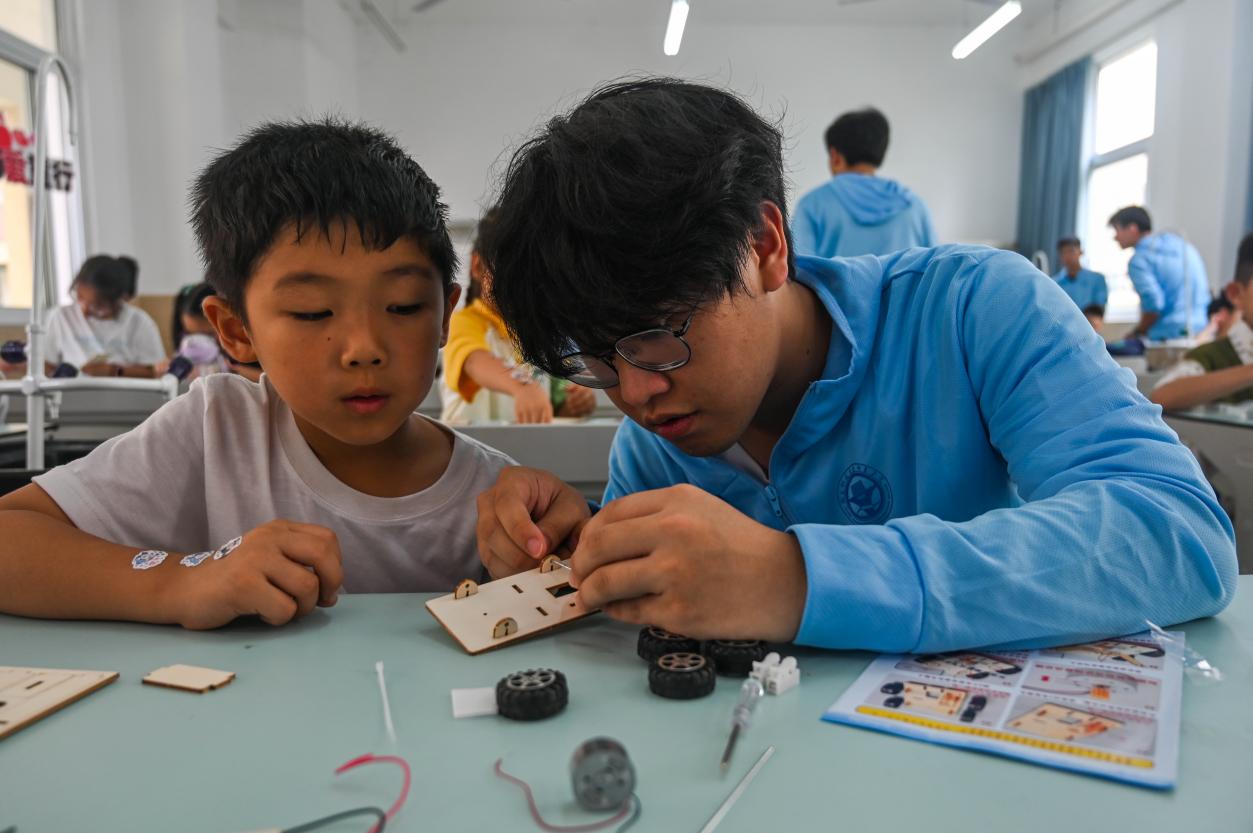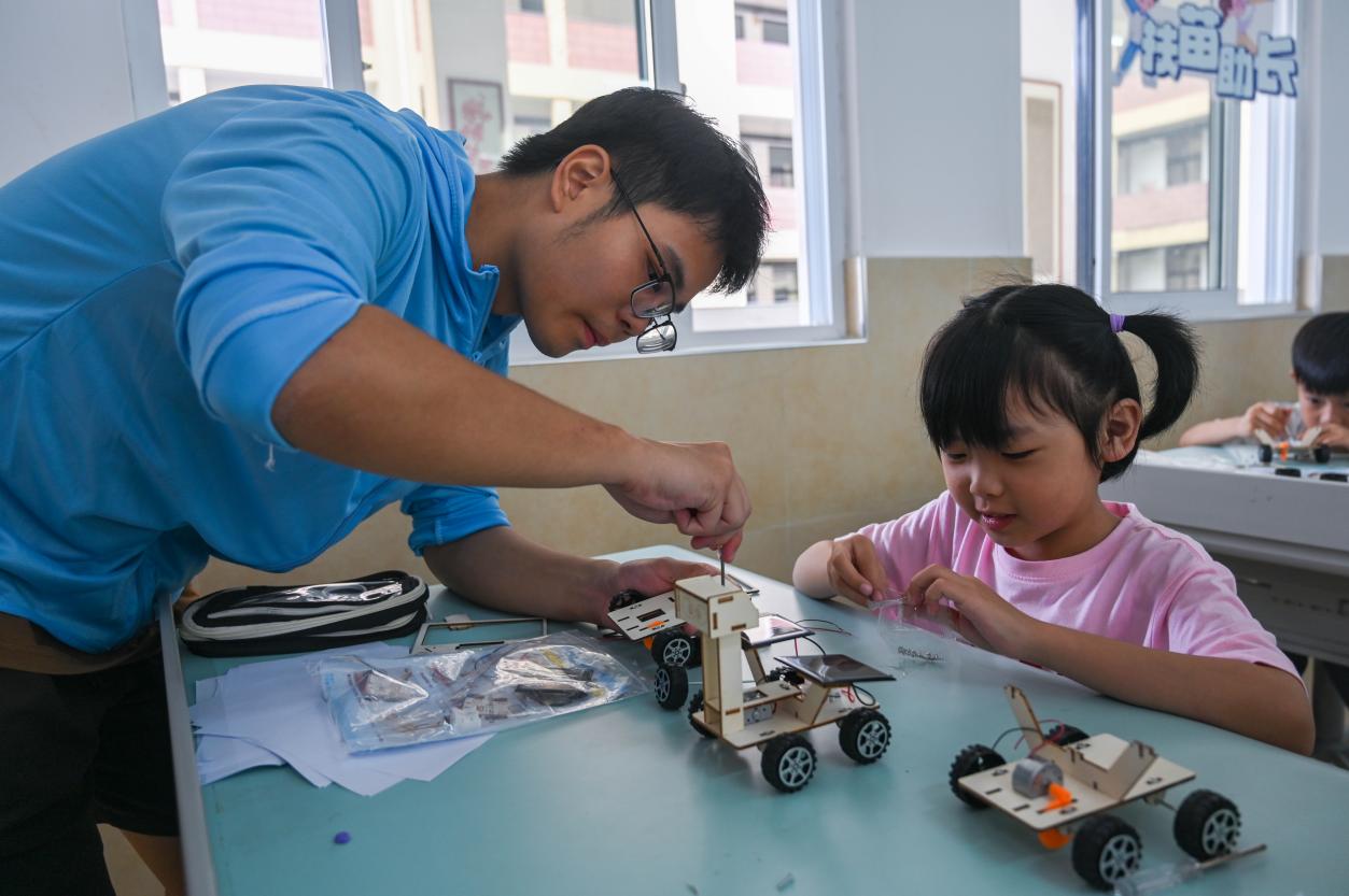 (實踐團(tuán)成員指導(dǎo)小朋友們制作“月球車”)