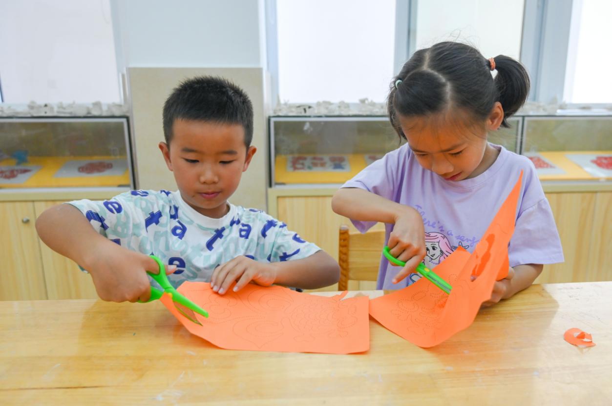 在橙色育美課堂中,實踐團(tuán)巧妙融合學(xué)院深厚的藝術(shù)傳統(tǒng),精心打造了一系列啟迪童心、傳承文化的非遺體驗與創(chuàng)意手工活動,讓傳統(tǒng)文化在指尖流轉(zhuǎn),藝術(shù)之美浸潤心田。“翰墨飄香”環(huán)節(jié),實踐團(tuán)教孩子們執(zhí)筆運腕,在墨香中感受筆畫的舒展遒勁,觸摸漢字風(fēng)骨?!拌蠘s非遺剪紙”里,孩子們聽民俗故事、學(xué)剪法,紅紙上綻放的鏤空圖案,傳遞著鄉(xiāng)土智慧與吉祥寓意?!疤胀辽ā惫し恢?,孩子們?nèi)嗄筇胀了苄危趯嵺`團(tuán)講解中感受陶藝傳承,領(lǐng)悟“百煉方成器”的哲思。而作為課堂重頭戲的“非遺蠶絲扇”制作,更是讓孩子們沉醉其中:實踐團(tuán)先講述蠶絲扇的千年傳承,從蠶桑養(yǎng)殖到蠶絲織造,再到扇面繪制的獨特技藝?!爸窬幃嫛本幙椛钋伤?。孩子們在實踐中觸碰文化肌理,激發(fā)創(chuàng)造潛能,心靈被傳統(tǒng)文化滋養(yǎng)得澄澈動人。
