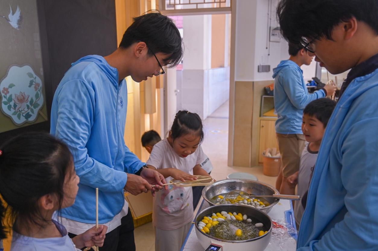 (實踐團(tuán)成員給小朋友們上非遺蠶絲扇課堂)