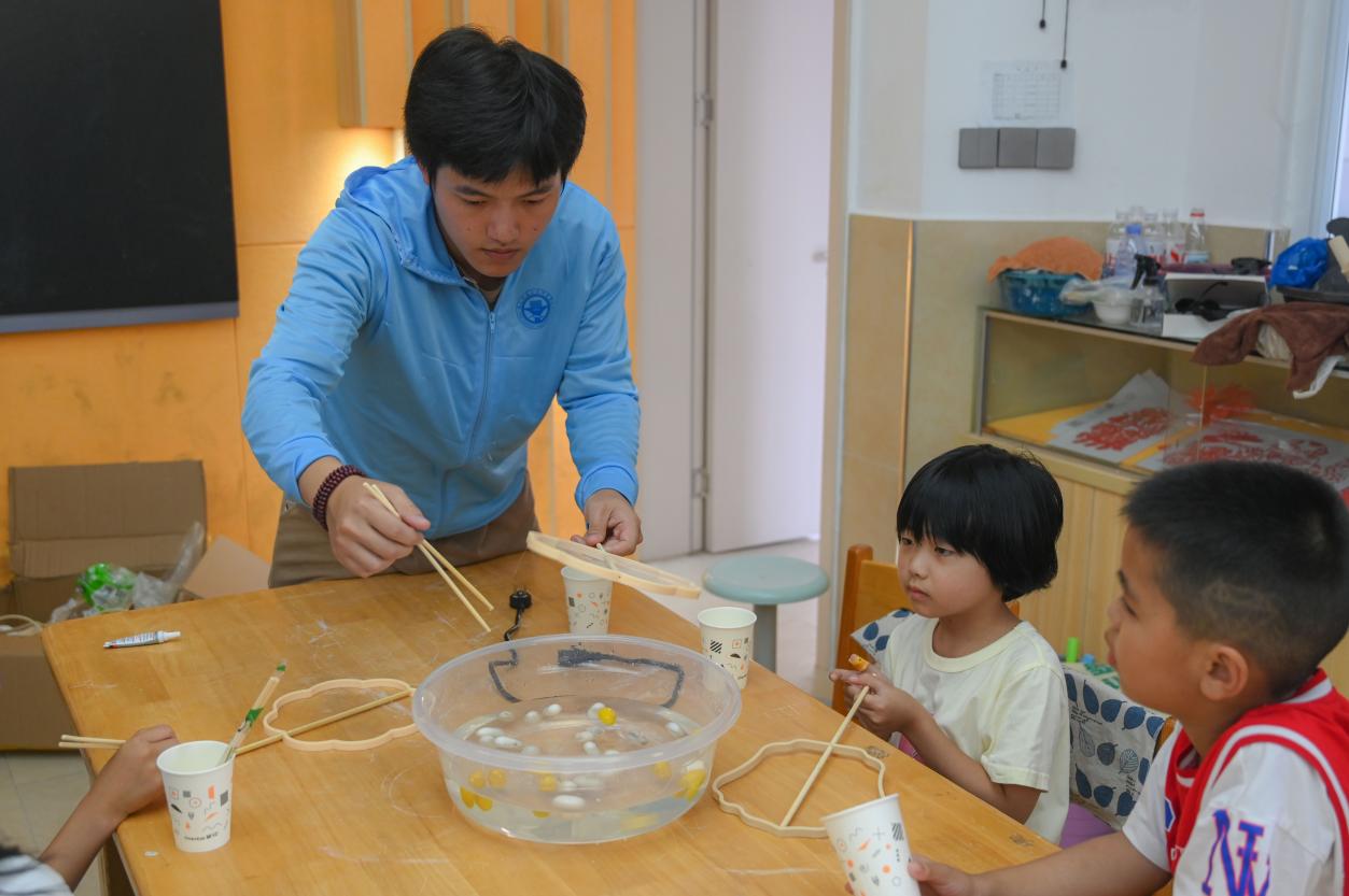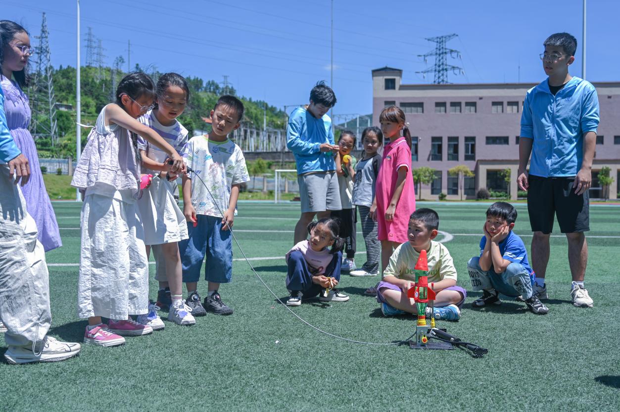 (實踐團(tuán)成員指導(dǎo)小朋友們制作火箭發(fā)射器)