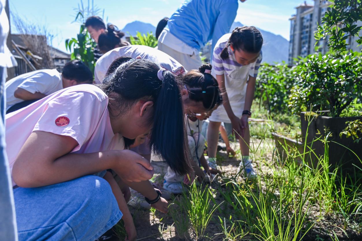(實踐團(tuán)成員帶領(lǐng)小朋友們拔雜草)