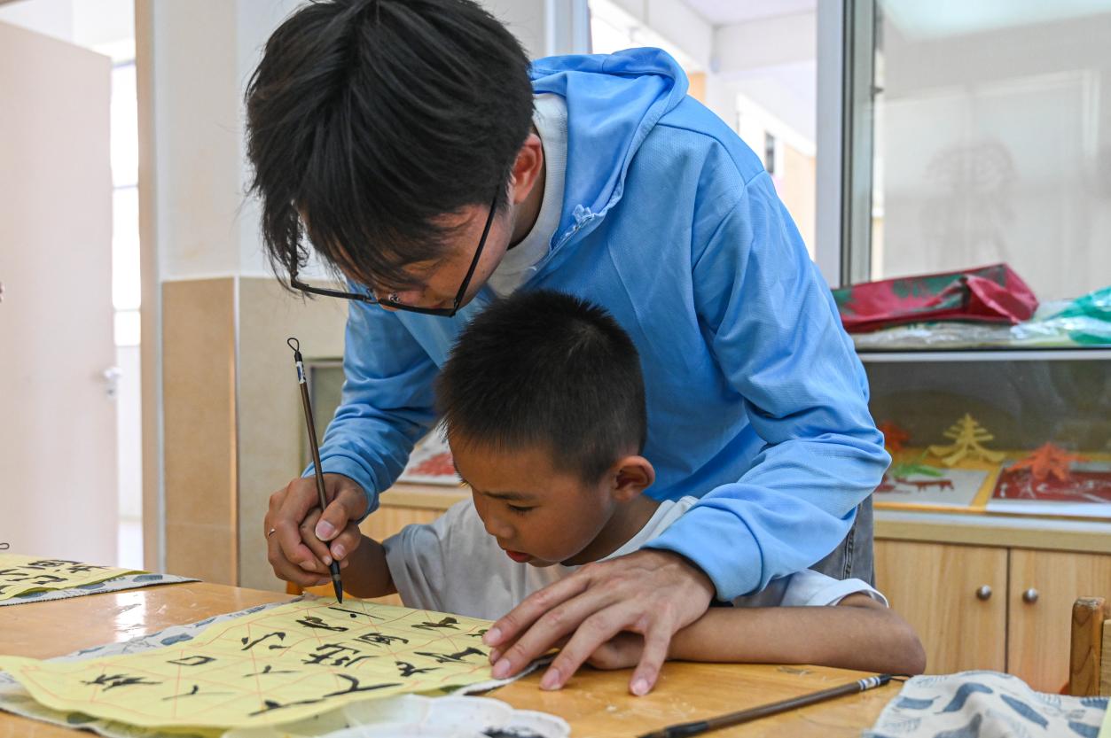 (實踐團(tuán)成員指導(dǎo)小朋友們寫書法)