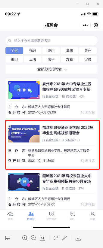 在小程序底部導(dǎo)航欄中選中“招聘會(huì)”,選擇相應(yīng)的招聘會(huì)。進(jìn)入招聘會(huì)詳情頁,點(diǎn)擊企業(yè)列表,查看企業(yè)與職位。