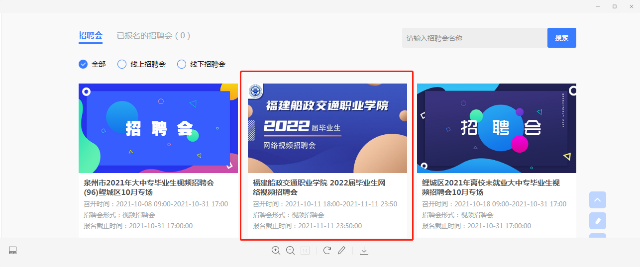 在電腦端點(diǎn)擊相應(yīng)招聘會(huì),可以查看招聘會(huì)參會(huì)企業(yè)與職位,可以選擇或搜索相應(yīng)企業(yè)與職位名稱。