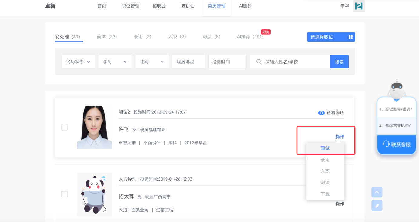 2.視頻面試:點(diǎn)擊導(dǎo)航欄【簡歷管理】,查看搜索簡歷→列表中選定視頻面試對(duì)象,點(diǎn)擊“操作”→點(diǎn)擊“面試”,即可發(fā)起視頻面試邀約。