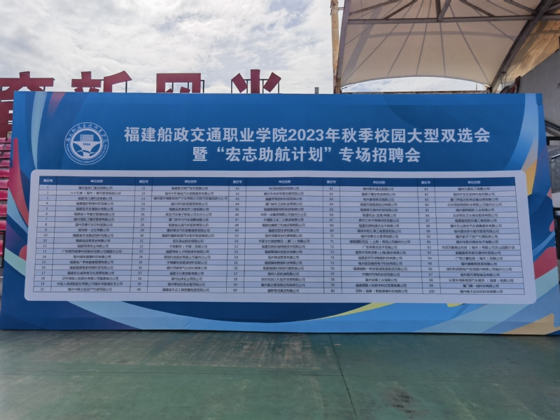 9月8日下午學(xué)院2024屆畢業(yè)生秋季校園綜合雙選會暨“宏志助航計劃”專場招聘會在青春田徑場成功舉辦。中國一冶集團有限公司、福建福船一帆新能源裝備制造有限公司、寧德時代電機科技有限公司、宏東漁業(yè)股份股份有限公司等百家省內(nèi)知名企業(yè)進校招聘,我校8000余名畢業(yè)生參會。