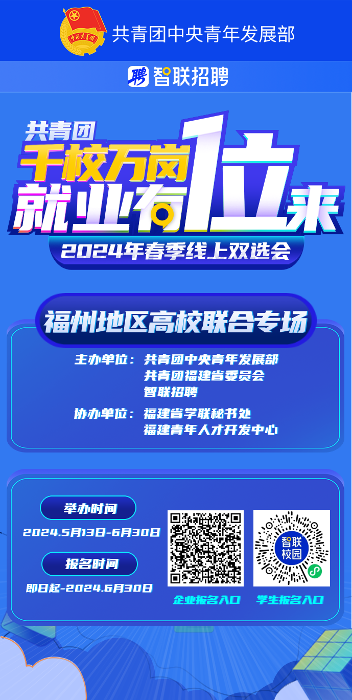 為深入貫徹團(tuán)中央促進(jìn)大學(xué)生就業(yè)行動(dòng),切實(shí)為畢業(yè)生提供就業(yè)崗位信息、暢通求職渠道、為用人單位和畢業(yè)生搭建供需橋梁,幫助促進(jìn)高校畢業(yè)生更加充分更高質(zhì)量就業(yè)。現(xiàn)舉辦“千校萬(wàn)崗 就業(yè)有位來(lái)”2024年福州地區(qū)高校畢業(yè)生春季聯(lián)合專(zhuān)場(chǎng)線(xiàn)上招聘會(huì),重點(diǎn)面向福州、莆田2024屆及往屆未就業(yè)所有高校畢業(yè)生,誠(chéng)邀各用人單位及畢業(yè)生報(bào)名參會(huì)。現(xiàn)將有關(guān)事項(xiàng)函告如下: