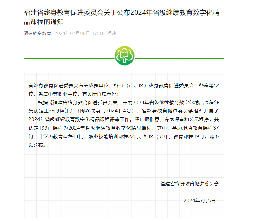 喜訊|我校四門課程入選2024年福建省繼續(xù)教育數(shù)字化精品課程