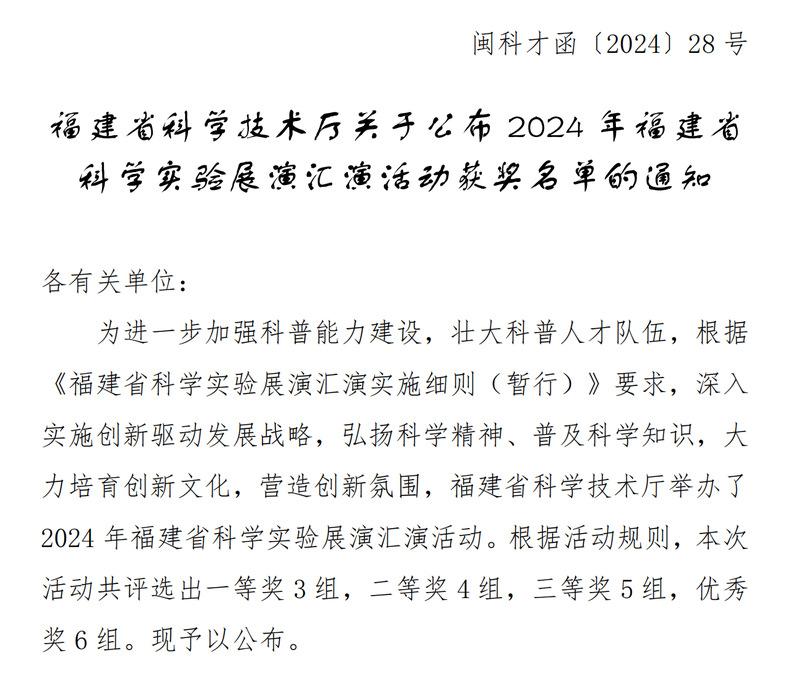 近日,由福建省科學(xué)技術(shù)廳主辦的2024年福建省科學(xué)實驗展演匯演大賽在福州舉行,我院科技處選送的汽車學(xué)院作品“‘綠’動未來—探究新能源汽車動力電池的奧秘”科普實驗項目、安全與環(huán)境學(xué)院作品“花露水等燃燒實驗及正確使用”科普實驗項目榮獲三等獎。