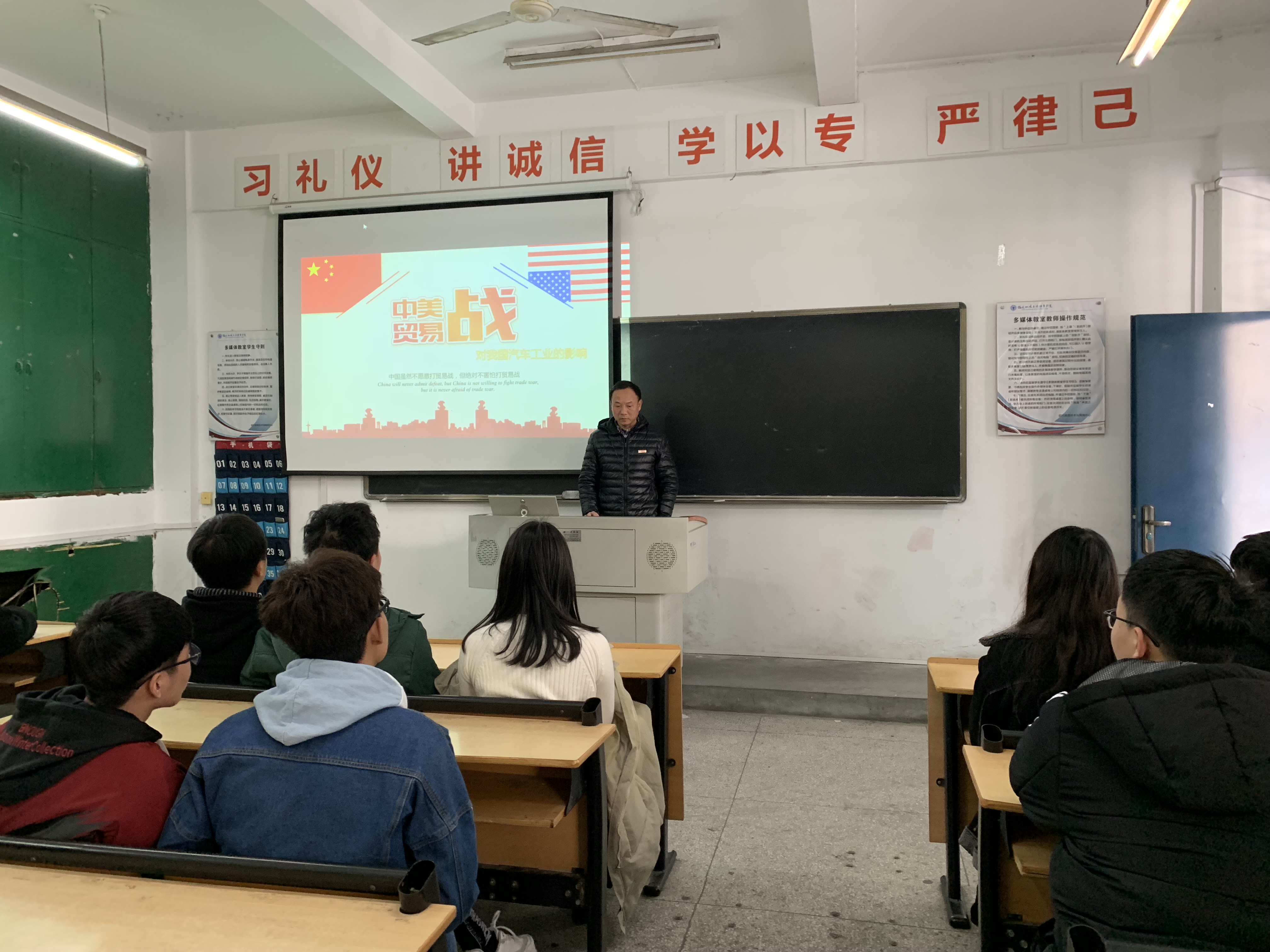2018年11月30日,張榮貴主任在汽車運用工程系22號樓103教室進(jìn)行了以“中美貿(mào)易摩擦對我國汽車工業(yè)的影響”為主題的報告。參加了此次形勢與政策講座的有汽車系教工黨員代表以及各班班長、團(tuán)支書和優(yōu)秀學(xué)生代表。