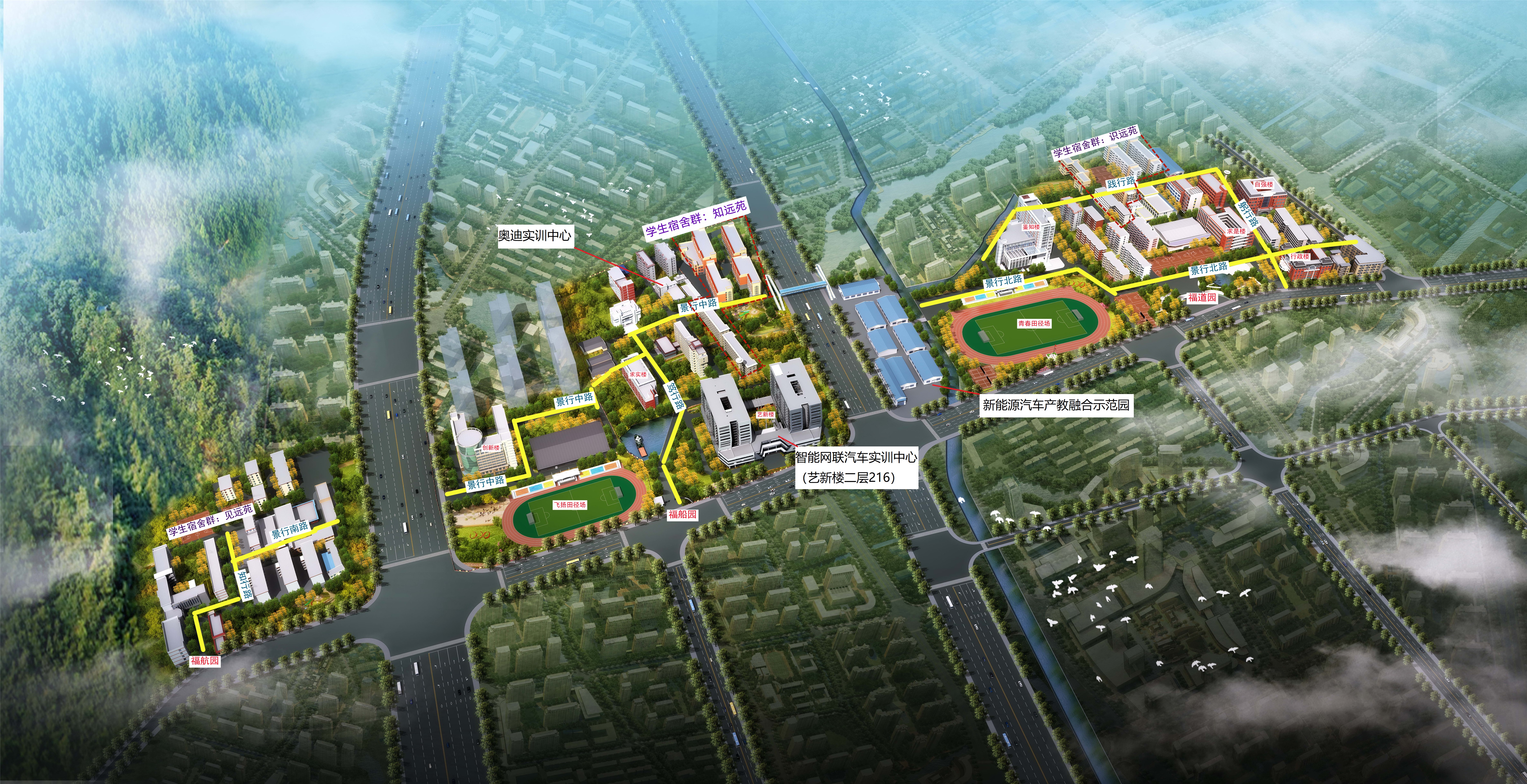 新能源汽車產(chǎn)教融合示范園建設(shè)完成于2023年6月20日,占地4000㎡,打造一個集“產(chǎn)學(xué)研創(chuàng)培”五位一體的產(chǎn)教融合示范園。位置在學(xué)校的中區(qū)34畝地靠首山路的4個標(biāo)準(zhǔn)鐵皮房以及周邊空地,分為比亞迪汽車(福建)培訓(xùn)基地、吉利汽車培訓(xùn)基地、豐田汽車T-TEP培訓(xùn)基地、發(fā)動機實訓(xùn)室等實訓(xùn)室。總體效果如圖2所示。