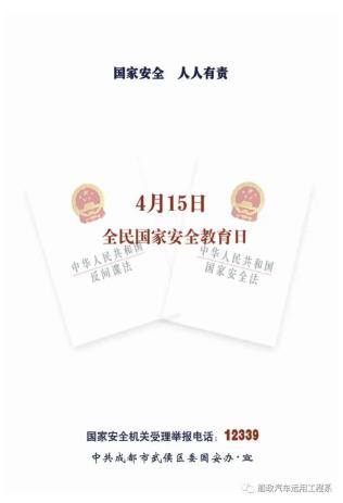 18汽營一班 張曉玲 汽車系學生會主席團成員:“國安才能國治,治國必先治安"415日,是國家安全教育日,更準確的說法是全民國家安全教育日,今年的415日是首個全民國家安全教育日。今天學校組織我們觀看全民國家安全教育日的直播,其實很多的危險都潛藏在我們的身邊,我們應該小心謹慎面對。國泰民安是人民群眾最基本最普遍的愿望,我們不僅僅要在這一天學習國家安全知識,而應該融入現(xiàn)實的每一天里,好好保護我們的祖國。