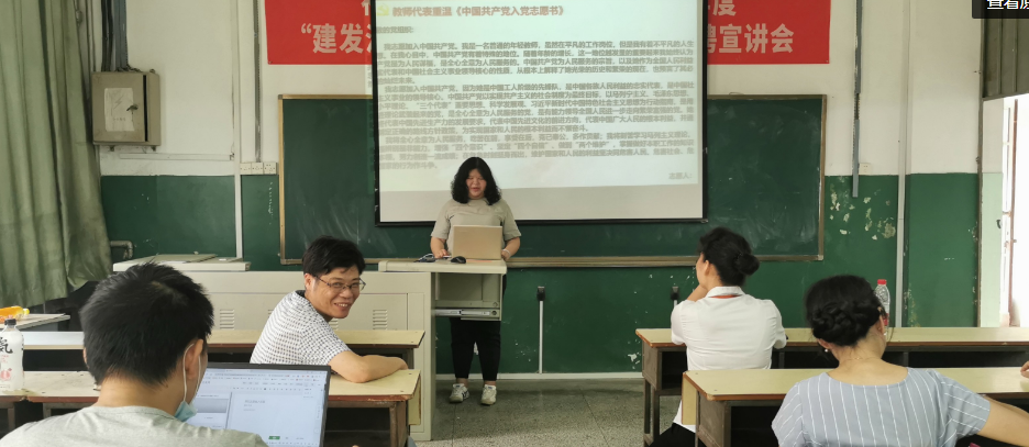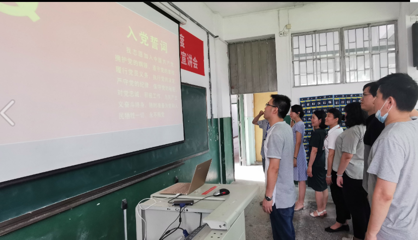 為了迎接黨的100周歲生日,由支部書記朱劍寶同志帶領(lǐng)大家重溫入黨誓詞,本支部最年輕的黨員黃丹粟同志作為青年教師代表重溫入黨志愿書。拉開了本次學(xué)習(xí)活動(dòng)的序幕。與往常不同的開場(chǎng)方式將本次學(xué)習(xí)活動(dòng)推向一個(gè)小高潮,充分調(diào)動(dòng)了黨員學(xué)習(xí)的熱情。