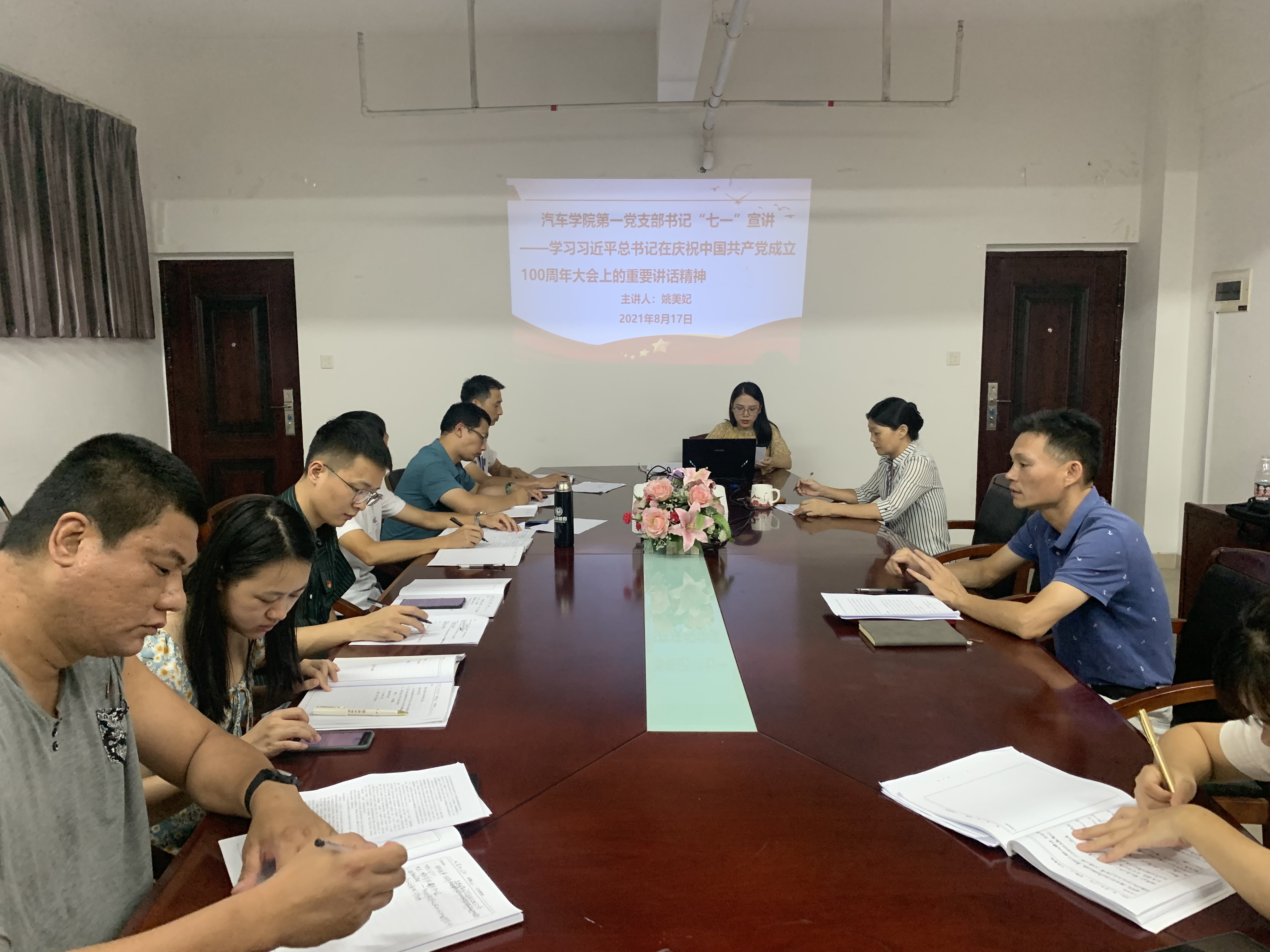 為了深入學(xué)習(xí)貫徹習(xí)近平總書記在“七一”重要講話精神,全面把握實(shí)踐要求,弘揚(yáng)偉大建黨精神,從百年黨史中汲取奮進(jìn)的力量。2021年8月17日汽車學(xué)院第一黨支部書記姚美妃在圖書館九樓會議室進(jìn)行“七一”宣講,宣講以“學(xué)習(xí)貫徹習(xí)近平總書記在慶祝中國共產(chǎn)黨成立100周年大會上的重要講話精神”為主題。