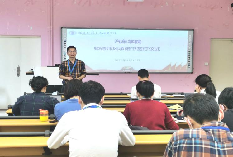 隨后,汽車學(xué)院院長蘇慶列組織全體教師簽訂了《福建船政交通職業(yè)學(xué)院汽車學(xué)院教師師德師風(fēng)承諾書》。蘇慶列院長強調(diào),汽車學(xué)院全體教職工在師德師風(fēng)建設(shè)中要做到四個方面:一要提高思想站位,注重提升職業(yè)道德素養(yǎng);二要認真學(xué)習(xí)文件精神,積極傳播正能量;三要密切關(guān)注網(wǎng)絡(luò)輿情,積極選樹典型;四要堅守廉潔底線,不越紀律紅線。全體教職工要經(jīng)常性重溫《承諾書》內(nèi)容,認真踐行承諾,不斷加強師德師風(fēng)建設(shè),肩負起立德樹人教書育人的光榮職責(zé),發(fā)揮自身的積極性、主動性和創(chuàng)造性,促進汽車學(xué)院的高質(zhì)量發(fā)展。