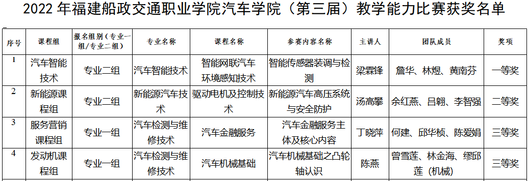 比賽過程中,每組選手從教學(xué)整體設(shè)計、教學(xué)實施過程、學(xué)生學(xué)習(xí)效果和反思改進(jìn)措施四個方面進(jìn)行詳細(xì)總結(jié)和展示,體現(xiàn)了學(xué)院教師優(yōu)秀的教學(xué)素養(yǎng),團(tuán)隊匯報結(jié)束后,專家評委針對參賽作品材料和現(xiàn)場展示情況進(jìn)行點評和指導(dǎo)。最后由評委參照國賽標(biāo)準(zhǔn)評分,評定出一等獎1個,二等獎1個,三等獎2個,獲獎名單如下: