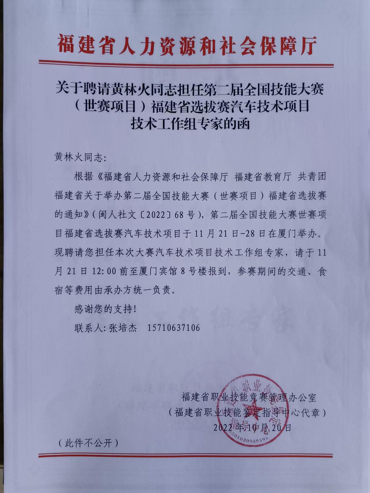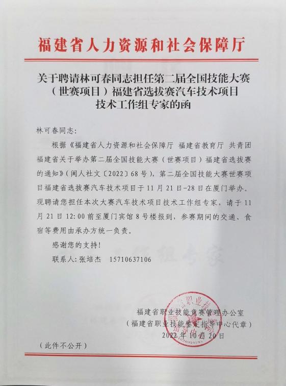 202211252627日,第二屆全國(guó)技能大賽(世賽項(xiàng)目)福建選拔賽汽車技術(shù)項(xiàng)目在廈門技師學(xué)院順利舉行。汽車學(xué)院林可春副院長(zhǎng)與技能大師工作室成員黃林火老師作為技術(shù)專家全程主持了比賽的出題、工位布置、裁判員培訓(xùn)等工作,為選拔賽的順利進(jìn)行做了大量重要工作,受到福建省人社廳職業(yè)技能鑒定指導(dǎo)中心及賽項(xiàng)承辦單位的肯定與好評(píng)。