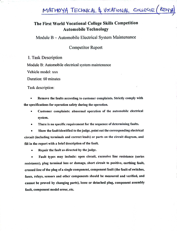2022年8月12日,首屆世界職業(yè)院校技能大賽“汽車技術(shù)”賽項(xiàng)在天津開賽。賽項(xiàng)首次創(chuàng)新組隊(duì)模式,采取“1+1”手拉手中外聯(lián)合組隊(duì),并設(shè)立以天津交通職業(yè)學(xué)院為主賽場(chǎng)和其余8個(gè)分賽場(chǎng)的線上線下競(jìng)賽模式。本次比賽我校的沈洪松和劉建輝以及肯尼亞Mathioya Technical and Vocational College的Godffrey Gathungu和Emeldah Wakarindi聯(lián)合組隊(duì),在比賽中取得了第四名的優(yōu)異成績(jī)。