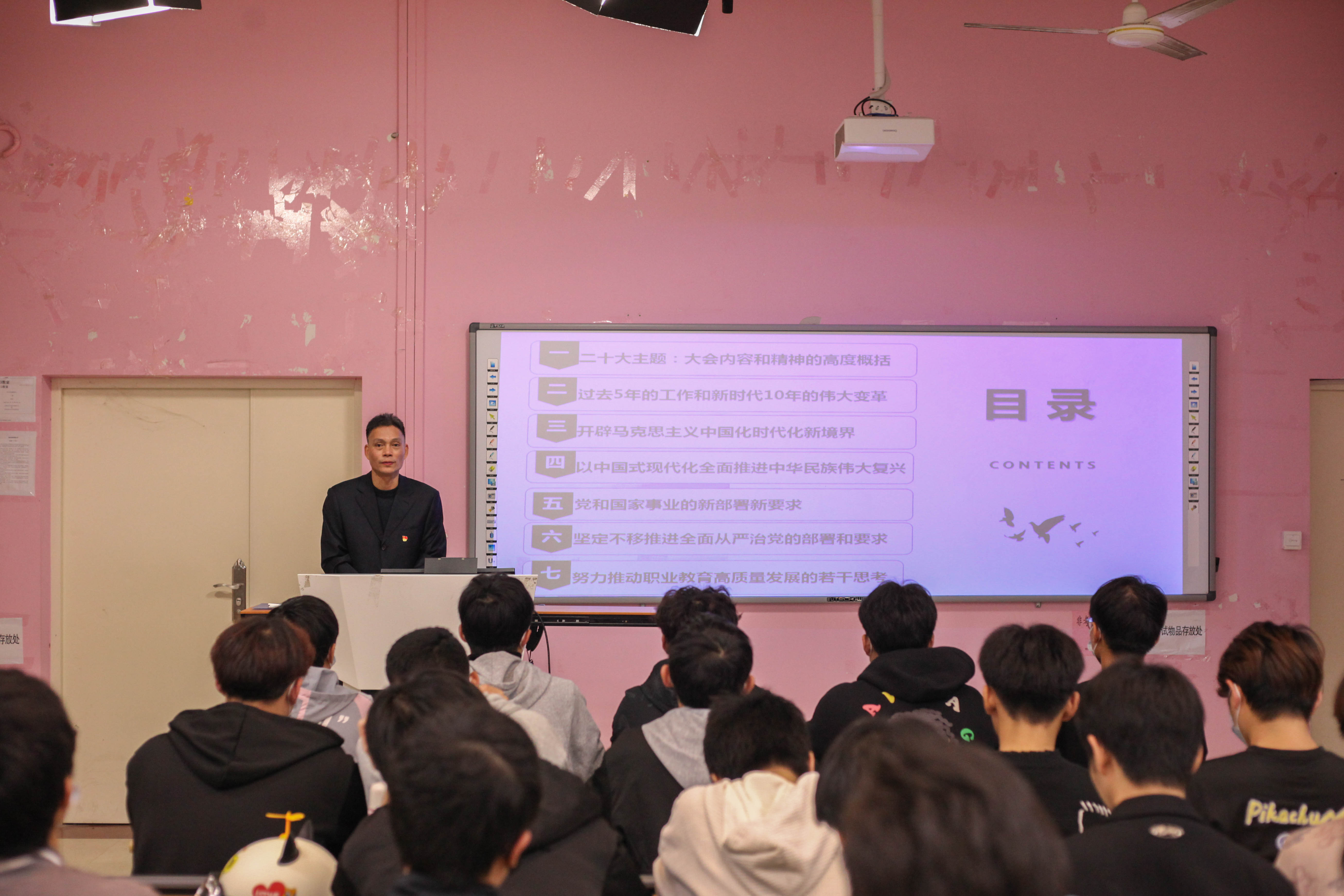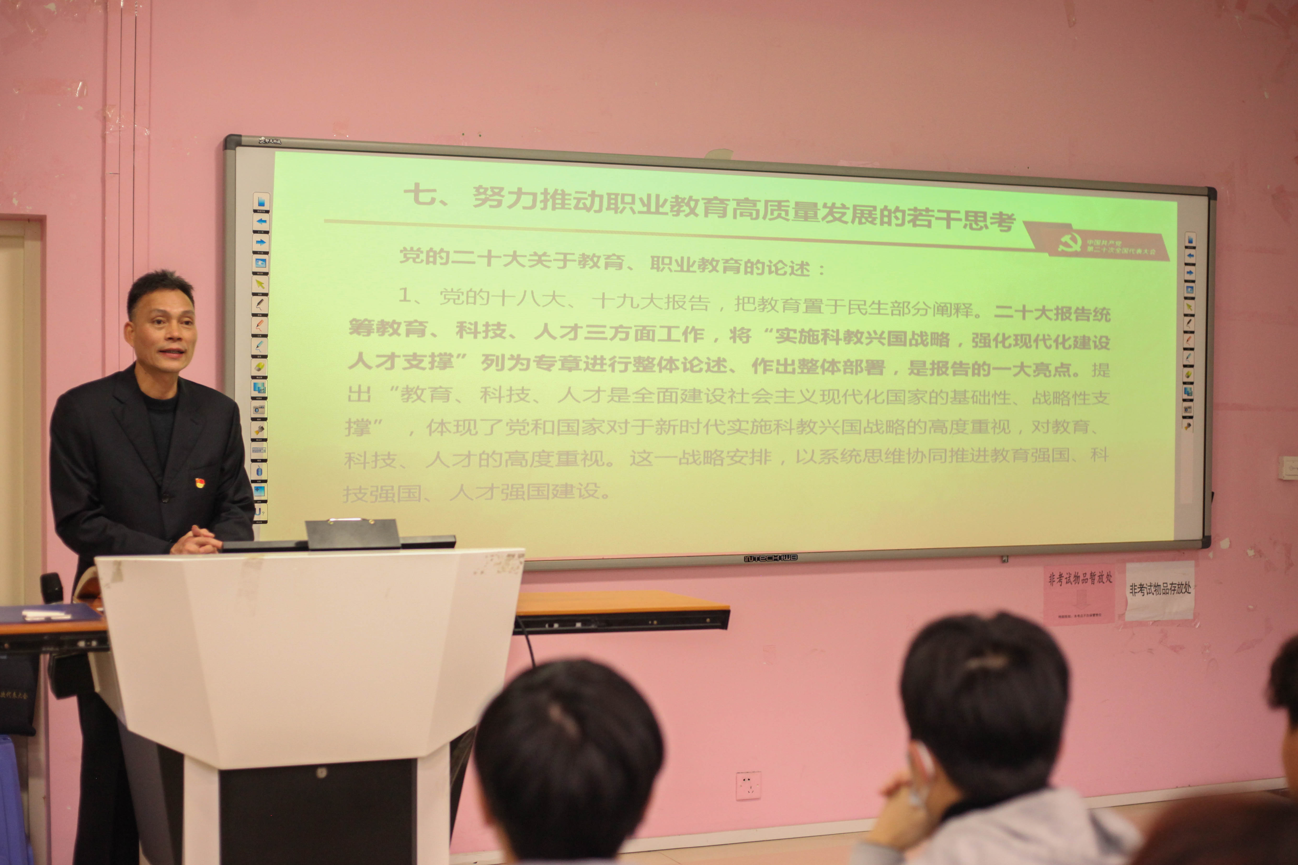 蔡華錦書(shū)記從“黨的二十大主題:大會(huì)內(nèi)容和精神的高度概括”、“過(guò)去5年的工作和新時(shí)代10年的偉大變革”、“開(kāi)辟馬克思主義中國(guó)化時(shí)代化新境界”、“以中國(guó)式現(xiàn)代化全面推進(jìn)中華民族偉大復(fù)興、“黨和國(guó)家事業(yè)的新部署新要求、“堅(jiān)定不移推進(jìn)全面從嚴(yán)治黨的部署和要求、“努力推動(dòng)職業(yè)教育高質(zhì)量發(fā)展的若干思考七個(gè)方面展開(kāi)宣講。引導(dǎo)青年學(xué)生們對(duì)中國(guó)式現(xiàn)代化知其然、知其所以然,弘揚(yáng)偉大建黨精神,自信自強(qiáng)、守正創(chuàng)新,踔厲奮發(fā),勇毅前行,以更飽滿的精神面貌貢獻(xiàn)自己的青春力量。