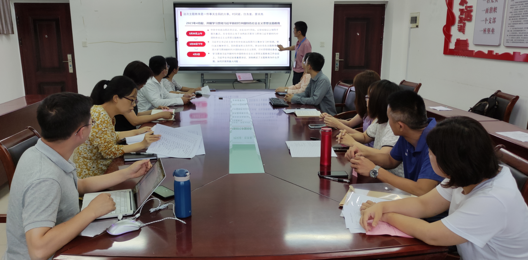 支部書(shū)記蘇慶列從開(kāi)展主題教育的意義、開(kāi)展主題教育的總要求和根本任務(wù)、全力推動(dòng)主題教育走深做實(shí)等方面,號(hào)召大家扎實(shí)推動(dòng)主題教育走深走實(shí),要全面系統(tǒng)學(xué)、及時(shí)跟進(jìn)學(xué)、深入思考學(xué)、聯(lián)系實(shí)際學(xué),切實(shí)將習(xí)近平新時(shí)代中國(guó)特色社會(huì)主義思想融入本職工作,將政治學(xué)習(xí)經(jīng)?;⑷粘;椭贫然鋵?shí)落細(xì)。